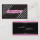 Estacas metálicas prateadas e cartões de visitas de cor-de-rosa preta em faixas diagonais, com dois triângulos cobertos com pincéis metálicos em dois cantos do cartão, faixas diagonais de prata e uma banda rosa no centro com seu nome. Fundo preto.