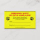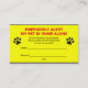 Estes cartões de visitas customizáveis são imprimidos com o alerta da emergência do texto: Meu animal de estimação está sozinho Home. O cartão fornece um lugar para adicionar os nomes de contato e os números de pessoas do telefone que se importarão com seus animais de estimação se você é ferido ou desqualificado. O cartão é perfeito para alertar pessoais da emergência para realizar seus desejos. ESTES CARTÕES SÃO GRANDES DISTRIBUIR EM EVENTOS DA ADOPÇÃO, EM LOJAS DO ANIMAL DE ESTIMAÇÃO, OU EM OUTRAS EXPOS DO ANIMAL DE ESTIMAÇÃO!