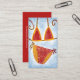 Um cartão de visita de biquíni de corda divertida em vermelho, ouro e branco sobre um fundo azul.