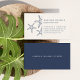 Os cartões de visitas tropicais elegantes para planejadores de eventos ou qualquer profissão relacionada à ilha ou à praia apresentam um trio de ilustrações azuis marinhos, com seu nome e informações de contato alinhados no lado direito. Cartões invertidos para azul marinho sólido com uma linha de texto personalizado em branco nítido.