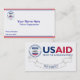 Esta cartão de visita é decorada com o Logotipo da Agência dos Estados Unidos para o Desenvolvimento Internacional, com verrugas vermelhas, brancas e azuis e a palavra "Aposentado".