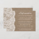 A coleção de burlap & lace é um design impressionante que apresenta um adorável fundo de efeito de burvolta rústica com um romântico de efeito de renda branca vintage. Esses Cartões Detalhados podem ser personalizados para sua ocasião especial e tornariam a inserção perfeita para qualquer suíte de casamento rústico, chá de panela, festa de noivado, festa de aniversário e muito, muito mais. Essas placas podem ser usadas para criar Cartões de Detalhes, Cartões de Informação Convidados, Cartões de Alojamento, Cartões de Direção, Registro de Presente ou Cartões de Poço de Vestir, bem como Cartões de Cerimônia e Recepção. *Observe que o Zazzle só vende cartões impressos para que esses cartões não tenham nenhum material real de burlap ou de renda.