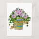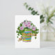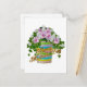 Cartões do dia das mães para enviar cumprimentos aos clientes e amigos. Rosas lavanda e gardênias brancas com hera inglesa em recipiente listrado decorativo. Texto com aparência 3D em dourado "Dia das mães"
