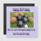 Mostrado na lavanda estão bolas de boliche de jardim vintage com uma mensagem de aniversário