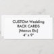 Para obter informações sobre o cheio e a gama de modelos de produtos de casamento personalizáveis, visite http://www.personalizedweddingessentials.com. Cartões de Rack Personalizados e de Menu de Casamento, impressos no estoque de cartão branco brilhante (100 lb.) com acabamento de brilho, alta qualidade, cor de cheio, impressão em sangramento de cheio. Opções de 4" x 9" (retrato) ou 9" x 4" (paisagem). Mínimo 25 pedidos de cartão. Até 50% de desconto para pedidos em massa. Essências e presentes personalizados e personalizáveis listados para uso em casamentos e celebrações relacionadas a casamento. Poupança de desconto de compra múltipla (comprar em massa) em muitos itens.