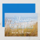Cartões planos de um lado só de Feliz Natal na Costa. Personalize sua escolha de saudação sobre uma imagem de fundo de dunas do oceano com grama alta ondulante. Este cartão de Natal com tema costeiro único tem texto sombreado que é branco com azul. A assinatura é em letra cursiva branca perto da parte inferior. O verso do cartão é azul sólido.