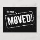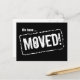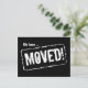 Cartões postais animados preto e branco com desenho de carimbo personalizado; Nós nos mudamos! Adicione seu novo endereço no verso. Cartões de mudança para casa e empresa.