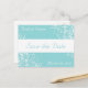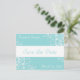 Cartões postais de salvar a data, com desenhos brancos em um fundo azul de ovo de robim. Coloque suas informações em nosso modelo fácil de usar. Obtenha o selo correspondente para salvar a data e complete a aparência.