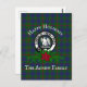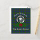 O cartão postal de na moda de Natal apresenta o crachá escocês Clan Agnew crest e texto personalizável sobre fundo tartano com poinsettia e tosse de abeto adicionados.