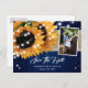 Estes cartões postais de foto de salvar a data de casamento rústico com girassóis em burlap e corredor de renda contra um fundo de madeira de celeiro são ideais para uma festa de casamento rústica azul marinho inspirada em girassóis.