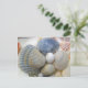 Cartões postais de fotografia de conchas azuis. A fotografia de conchas tropicais inclui quatro conchas de berbigão azuis e bege dispostas em círculo com uma concha de caracol lunar branco ou olho de tubarão no centro. Essas conchas vieram da costa do Golfo da Flórida.