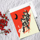 Esta imagem vintage tem três meninos vestidos de preto e branco correndo em uma colina coberta de neve em um antigo trenó vermelho. Há uma lua da crista negra e uma cabana coberta de neve atrás delas. O fundo é vermelho vibrante. Veja minha loja Art by MAR para combinar produtos com este design.