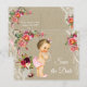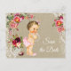Cartões-postais de "save the date" para chá de bebê em juta com linda menina bebê e fio de pérolas sobre um lindo fundo floral e de juta e renda. Estes adoráveis cartões-postais de "save the date" para chá de bebê são facilmente personalizados para o seu evento, bastando adicionar seus detalhes no estilo de letra e texto de sua preferência.