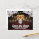 Cartões Postais de Madeira com Pote de Maçã e Girassol para Salvar a Data - Convites de Casamento de Madeira com Pote de Maçã e Girassol com renda - apresentam um fundo de madeira de celeiro vermelho escuro aparado com renda e decorado com luzes cintilantes de corda em cores quentes. O design também apresenta um buquê de girassóis dentro de um pote de maçã que você pode personalizar as iniciais para as de sua escolha.