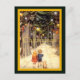 Vintage desenhando crianças pequenas e seu cachorro em uma faixa florestal com brilhantes luzes de Natal penduradas nas árvores da floresta.