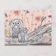 Um meio original, misto, desenho de coruja criado usando tinta, lápis e tinta e digitalizado em diferentes planos. Um cartão postal de excelente para amantes de corujas.