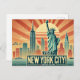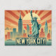 Aqui está o cartão postal viagens vintage com Nova Iorque com a Estátua da Liberdade, uma silhueta de linha do horizonte e a tipografia ousada no estilo dos anos 50. 🗽 🌆 Os tons do pôr do sol e o efeito esmaecido e branqueado dão-lhe uma vibração nostálgica e retrorreflectora.