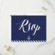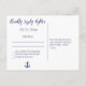 Cartões postais RSVP de casamento náuticos com faixas marinho azul e branca, âncora branca e texto branco personalizado, impressos em fundo azul marinho