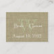 A aparência de Burlap e Green Arco impressa nos cartões de assento do estilo do casamento. Vinculando convites, personalize o texto conforme necessário. Adicione os nomes da noiva e do noivo com um monograma e data de casamento às costas. Este produto está impresso. Não há burlap real nem nenhum arco real incluído neste produto.