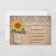 Fundo de madeira velha, renda de marfim vintage e jarro de pedras bonitinho com flor de girassol pendurado na corda - cartões RSVP de casamento perfeitos para o tema do casamento country com jares de pedras e sotaques de girassol.