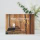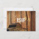 Um cartão de resposta de convite de casamento do país rústico, com um antigo celeiro no canto e um fundo de pranchas de madeira escura e afligida. Completamente personalizável com seus próprios detalhes. A parte de trás do convite tem "RSVP" no script. Aqui está o conjunto de convites de casamento personalizados correspondente: