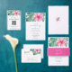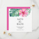 Esse casamento de destino salva a data dos convites... que têm uma borda superior de elegantes flores tropicais de aquarela e folhas de palma monstera. As palavras "Salvar a Data" são digitadas em cinzas de carvão sobre um fundo branco nítido. Use os campos modelo para adicionar detalhes personalizados. A placa se reverte para uma cor rosa vibrante correspondente. Para ver todo o tema da papelaria de casamento visite www.zazzle.com/dotellabelle Flor de cachorrinho e Manteiga de Manteiga Única, folhas de arte e design de Victoria Grigaliunas.