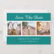 Elegante cartões salve a data de fotos do casamento teal apresentando uma colagem de fotos de noivado e um roteiro em um fundo teal. Casamento teal personalizado salve os cartões de data. Casamento de chá personalizável salve os cartões de data. Casamento de script salve os cartões de data.