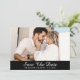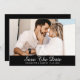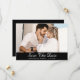 Cartões salve a data de fotos de casamento Elegantes, preto e branco, com uma foto de noivado e um roteiro sobre fundo preto. Casamento preto e branco personalizado salve os cartões de data. Casamento preto e branco personalizável salve os cartões de data. Casamento de script salve os cartões de data. Preto e branco guarde a data.