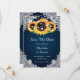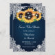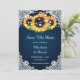 Casamento floral rústico azul marinho salve os cartões de data com girassóis em um fundo azul marinho adornado com rendas florais brancas e luzes de cordas. Itens correspondentes disponíveis.