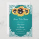 Casamento floral rústico teal salve os cartões de data com girassóis em um fundo teal adornado com rendas florais brancas e luzes de cordas. Itens correspondentes disponíveis.
