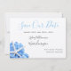 Cartões salve a data com flores de hydrangea azuis e design de estrelas brancas.