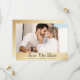 Elegante cartões salve a data de fotos de casamento dourados com uma foto de noivado e um roteiro sobre fundo dourado. Casamento de ouro personalizado salve os cartões de data. Casamento de ouro personalizável salve os cartões de data. Casamento de script salve os cartões de data.