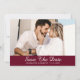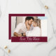 Elegante cartões salve a data de fotos de casamento burgundy com fotos de noivado e um roteiro em fundo burgundy. Casamento personalizado de burgundy, salve os cartões de data. Casamento personalizável de burgundy salve os cartões de data. Casamento de script salve os cartões de data. Burgundy salve a data.