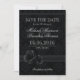 Cartões salve a data rosa de damasco preto com elegante textura de damasco preto em ambos os lados, rosas de seda preta e fitas. Personalize cada campo de texto com os detalhes do casamento.