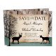 Cartões salve a data de veados de madeira russos, exclusivamente desenhados por Artisticamente Convidados, com silhuetas de cervo com galhadas, pomba, árvores de inverno sobre fundo de madeira e design verde de caçador desbotado no fundo. O seu casamento personalizado salva os detalhes da data são impressos personalizados sobre uma ilustração de papel rústico distorcido. Estas cartas são perfeitas para as suas celebrações de casamento com temas de veados ou mansos.