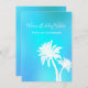 Cartões de Natal planos em tons de azul aqua tropical com silhuetas brancas de palmeiras e texto. Personalize um cumprimento e adicione uma assinatura a cartões de Natal simples e únicos com tema tropical. O verso é azul.