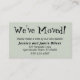 Mantenha seus amigos e familiares atualizados com seu novo endereço usando essas placas de gabinete simples e peculiares. As notas versáteis leram "Nós nos movemos!" na frente e "Fique em contato!" nas costas, usando uma fonte moderna, ousada, divertida e desigual. Use os campos modelo para adicionar todos os seus próprios detalhes para personalizar este design para seu uso pessoal. O tipo preto foi colocado sobre o verde de sábio editável; você pode mudar o plano de fundo para qualquer cor que desejar... ou até adicionar uma imagem, se desejar. Da mesma forma, as fontes podem ser alteradas se você quiser editar o design um pouco mais.