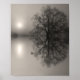 Uma foto a preto e branco capturando a firmeza de um lago vítreo no nascer do sol em névoa. As árvores parcialmente submersas refletem-se na água calma.