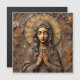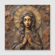 "This striking design presents a portrait of the Virgin Mary as a detailed wood carving or relief sculpture, rendered in rich, warm brown and reddish-brown tones. She is depicted with a tranquil, contemplative expression, hands clasped in prayer, and is framed by a rustic, textured halo. The rough, earthy texture of the wood grain provides a powerful sense of ancient, grounded spirituality. This design is highly suitable for products with a rustic, spiritual, or devotional theme. Imagine it on wooden plaques, religious art prints, handcrafted items, or home decor that evokes a traditional, artisan aesthetic."