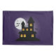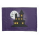 Estante do Halloween com ilustração caseira assombrada com alguns morcegos e uma lua. A cor de fundo é roxa.