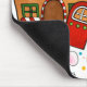 Mousepad de Natal caprichoso com uma casa de biscoito decorada com doces, uma árvore simples decorada, um ursinho sorridente, um ratinho alegre e uma rena em uma cena festiva brilhante com confetes coloridos. Tons quentes de vermelho, verde, dourado e pastel dão a este design de férias divertido um visual doce de livro de histórias para decoração de mesa sazonal.