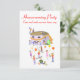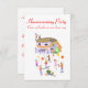 Personalize este cartão RSVP de festa de inauguração. Uma casa vestindo um lenço, convidados com balões, e vovô gostando das guloseimas. Venha e torne nossa nova casa confortável para aqueles no Reino Unido, ou aconchegante para aqueles nos EUA, na frente, e adicione seus detalhes ao lado, avisos fornecidos.