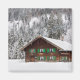 Imagem fotográfica com uma tradicional casa de madeira com persianas verdes numa floresta no inverno, na Baviera, na fronteira entre a Alemanha e a Áustria.