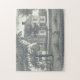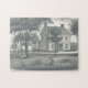 Esta quebra-cabeça de aparência vintage apresenta uma representação de uma antiga casa estilo, árvores e um gramado.