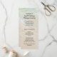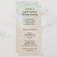 Programa de cerimônia de casamento alto e duplo com fundo de água da praia. Água esverdeada e areia molhada da praia são o fundo em ambos os lados. Fonte preta impressa é usada para todo o texto, exceto o título e a mensagem, que estão em itálico. Destinado a uma celebração de casamento casual à beira-mar, o texto é fácil de alterar e usar espaços conforme necessário para preencher. Mostrado em um tamanho de cartão alto de 4x9 polegadas, mas a imagem funciona para todos os tamanhos. Escolha outro tamanho e distribua o texto se sua cerimônia for mais longa.