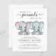 Um convite para chá de fraldas de gêmeos bonitinho e econômico com "Dois Pequenos Amendoins Doce Estão A Caminho" escrito em tipografia moderna de cinza mole e um roteiro de na moda com pântanos, e duas aquarelas cor-de-rosa e azul pastel de elefantes bebês. Personalize com os nomes dos futuros pais e os detalhes do chá em uma simples tipografia de cinzas.