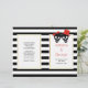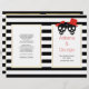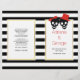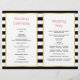Casal de crânio com arco vermelho noiva e chapéu vermelho para o noivo, e preto e branco listras modernas cerimônia de núpcias vermelhas do Halloween dobradas e programa de festas. Há quadros brancos com contorno dourado com seu texto.