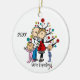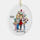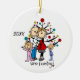 Um adorável e divertido ornamento cerâmico de Natal com uma figura de palitos, mãe e casal, criança e garota, árvore de Natal, e texto que diz "Estamos esperando!" com uma área que você pode adicionar no ano atual!