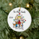 Um ornamento cerâmico redondo bonito do feriado do Natal da lembrança caracteriza uma figura casal da vara que espera um bebê e um menino pequeno da criança que está na frente de uma árvore de Natal decorada, de um cão marrom, do gato marrom, e do texto que nos lê "está esperando!". Você pode personalizar esta figura bonito ornamento da vara adicionando seus nomes e ano em curso!