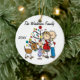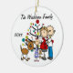 Um ornamento cerâmico redondo bonito do feriado do Natal da lembrança caracteriza uma figura família da vara que inclui um pai, uma mamã expectante, uma menina, e o cão da família na frente de uma árvore de Natal decorada com áreas que você pode personalizar com seu nome de família e o ano em curso! Este ornamento bonito da lembrança do feriado faz um grande presente para que a família nova comemore um ano especial!